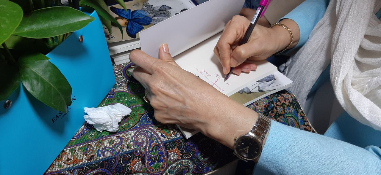 کام میهمانان به کلمه و شهد و شربت و شیرینی، شیرین و شاد شد و کام پیمانه با به پایان رسیدن ۵۵ نسخه کتابش که برای رونمایی عرضه شده بود… برای دوستدارانش به یادگار امضا کرد و رازی را به من گفت…